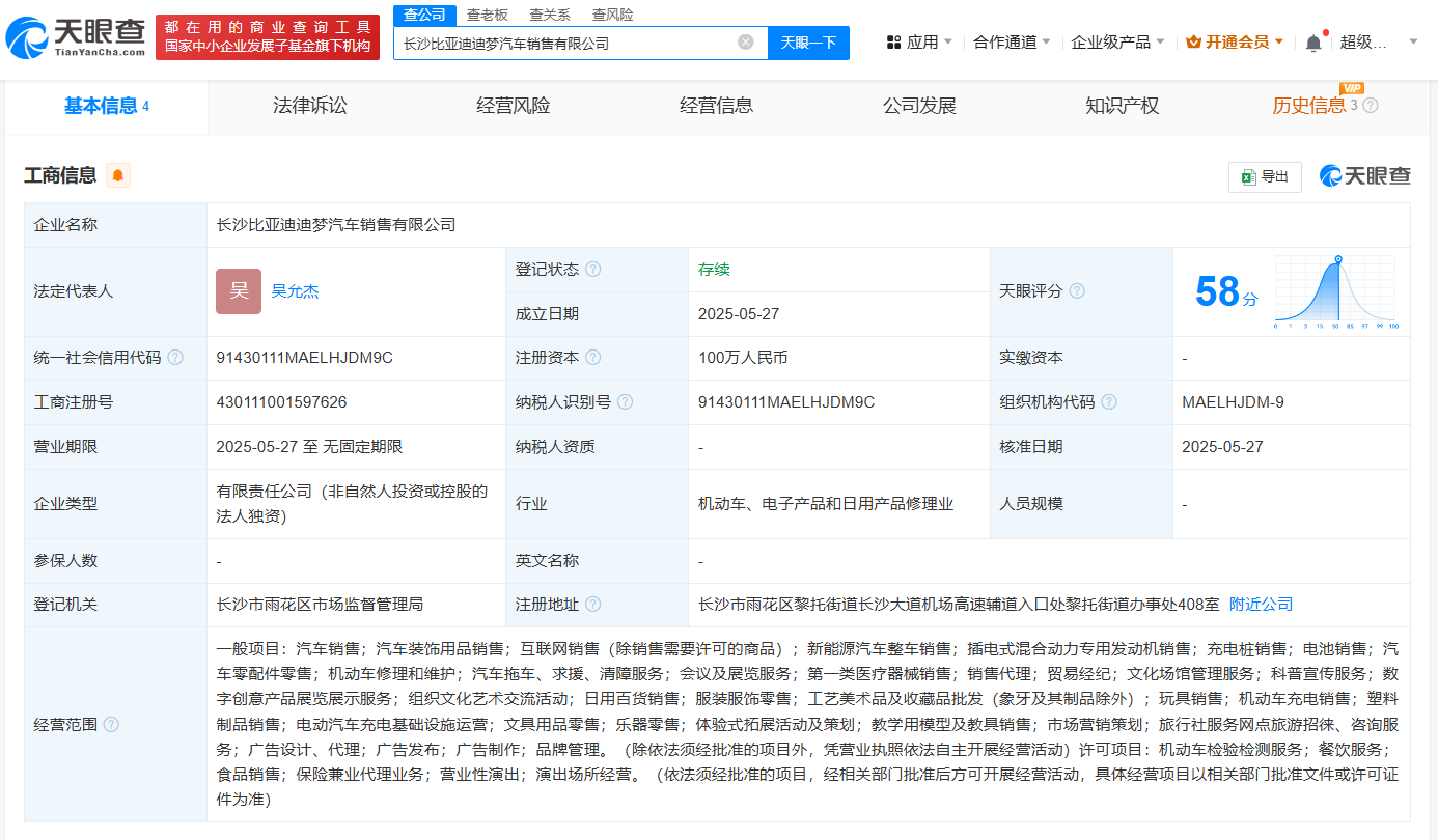 南方财经5月28日电,天眼查App显示,近日,长沙比亚迪迪梦汽车销售有限公司成立,法定代表人为吴允杰,注册资本100万人民币,经营范围包括新能源汽车整车销售、电桩销售、电池销售、汽车零配件零售等。股东信息显示,该公司由比亚迪汽车工业有限公司全资持股。